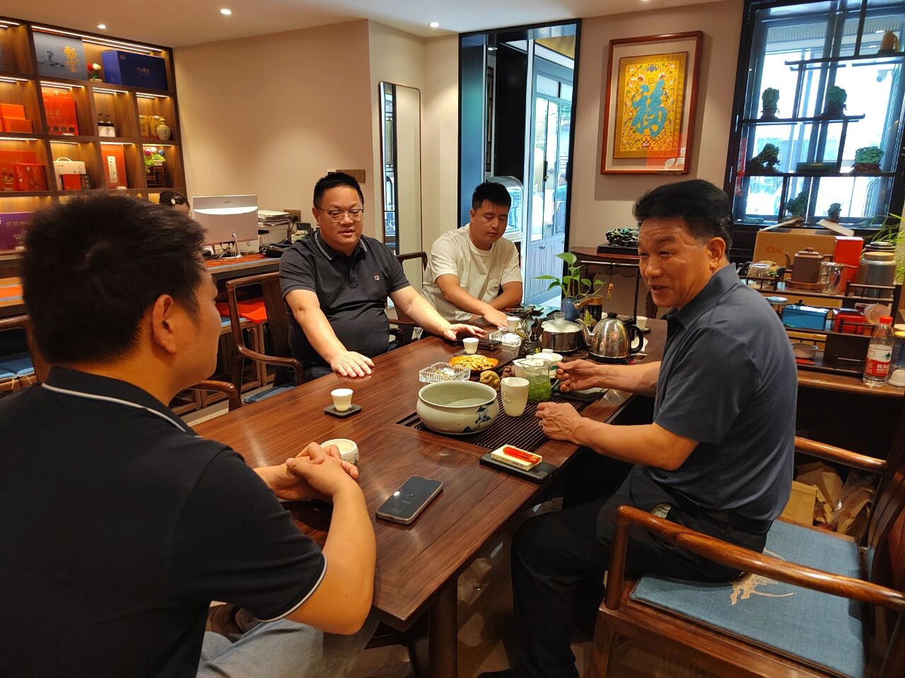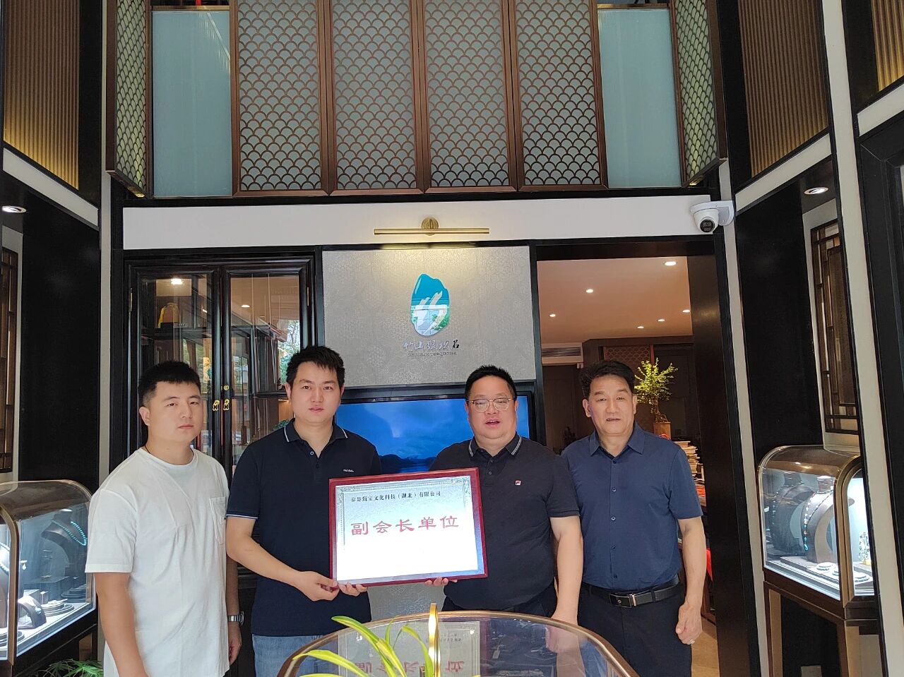 活动伊始,骆为民会长亲手将“武汉竹山商会副会长单位”牌匾授予甄宝文化公司负责人蔡义强,充分肯定甄宝文化公司在绿松石产业中的标杆地位及对地方经济的贡献。副秘书长贺荣文表示,授牌不仅是对企业实力的认可,更是赋予其推动行业进步的责任,期待企业在商会平台上发挥更大价值。随后,商会一行集体观看了甄宝文化公司的宣传视频,深入了解竹山绿松石从原料开采、工艺设计到文化推广的全产业链布局,生动呈现了企业坚持传承非遗技艺、创新设计理念的发展历程,以及深耕绿松石文化、开拓国内外市场的雄心与成果。